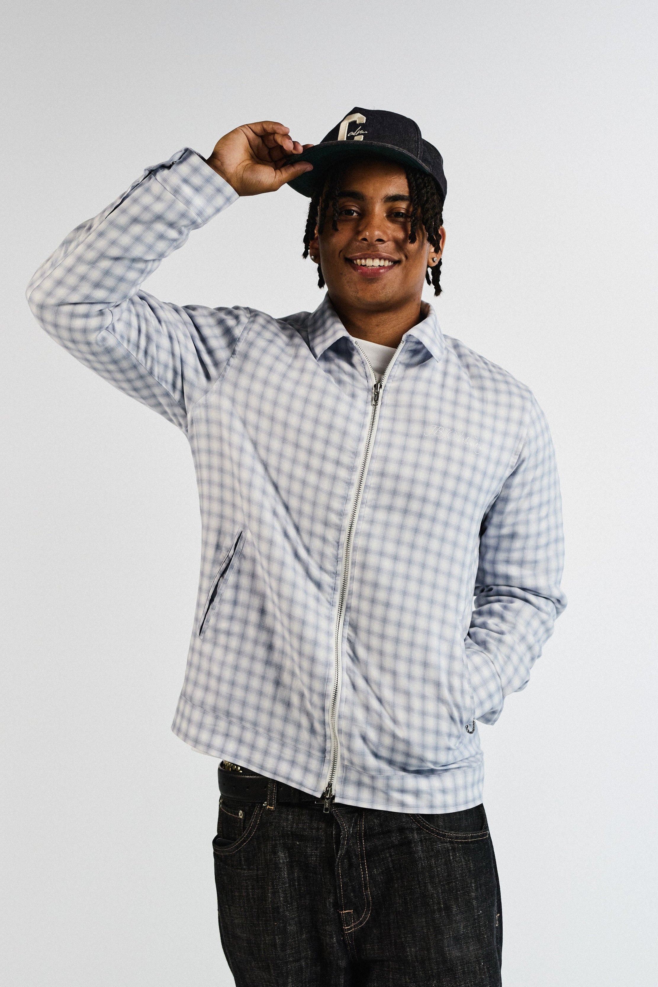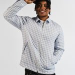 Stay fresh and layer up with this light blue/white check jacket from JBJclothing. With its clean check pattern, full front zipper and side pockets, it’s built for both comfort and street appeal. The relaxed fit makes it easy to throw on over a tee, while the subtle details keep it sleek and versatile.